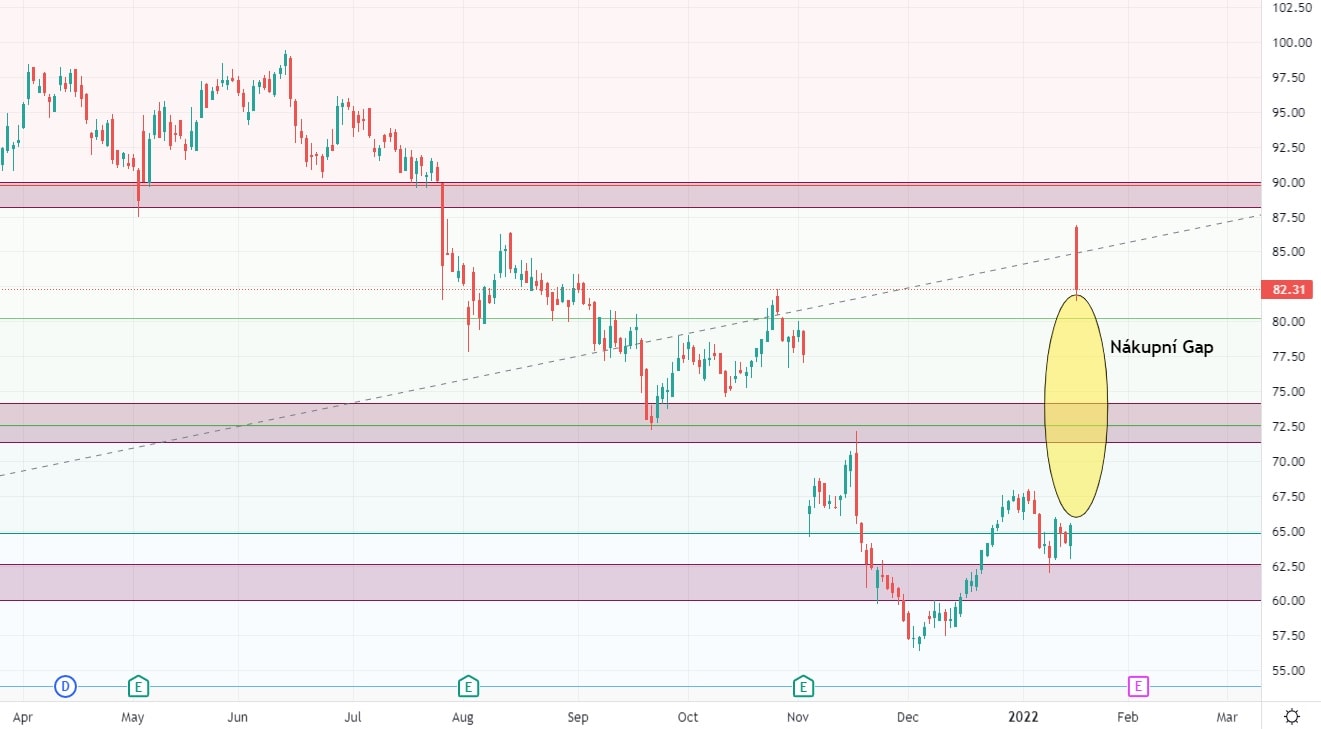 Denní graf akcií Blizzard se zvýrazněným nákupní Gapem