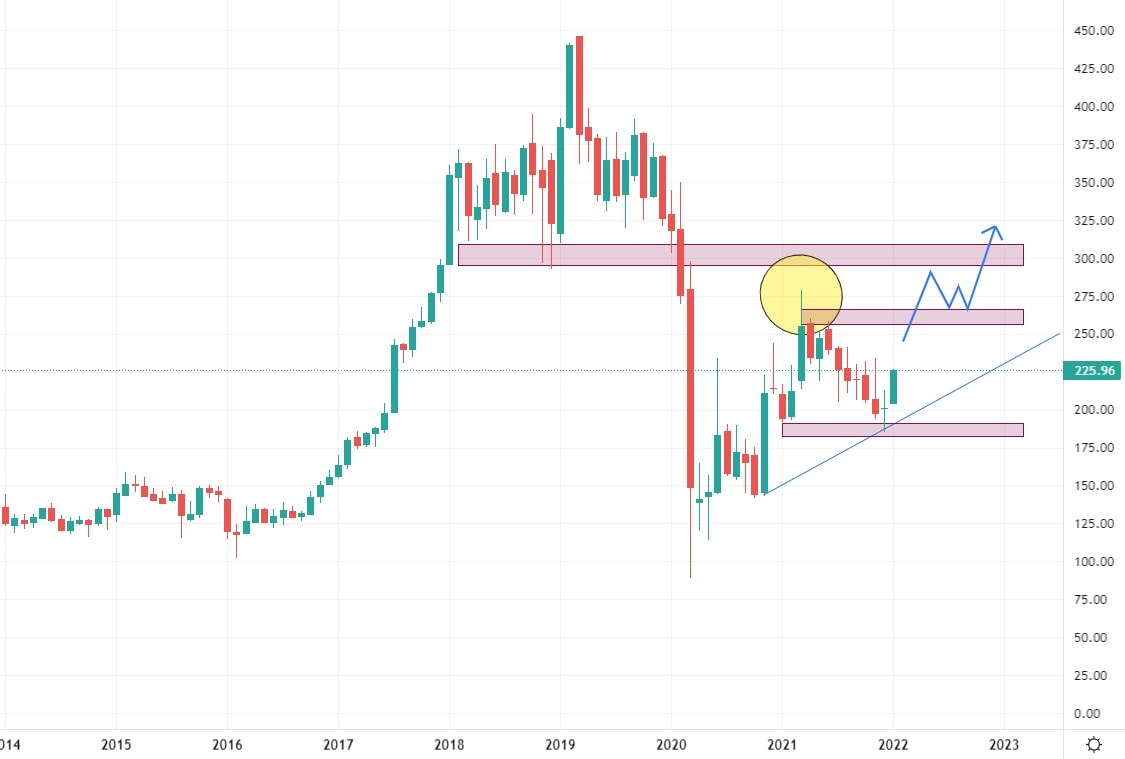 Akcie této letecké společnosti již zahájily svůj let na vyšší cenové úrovně. V prosinci trh otestoval supportní zónu a reagoval na ní krásně vykreslenou pin-bar svíčkou. Ta je v obchodní a investiční praxi využívána jako obratová formace. A přesně k obratu také došlo. Akcie Boeing začátkem roku 2022 skutečně rostou.