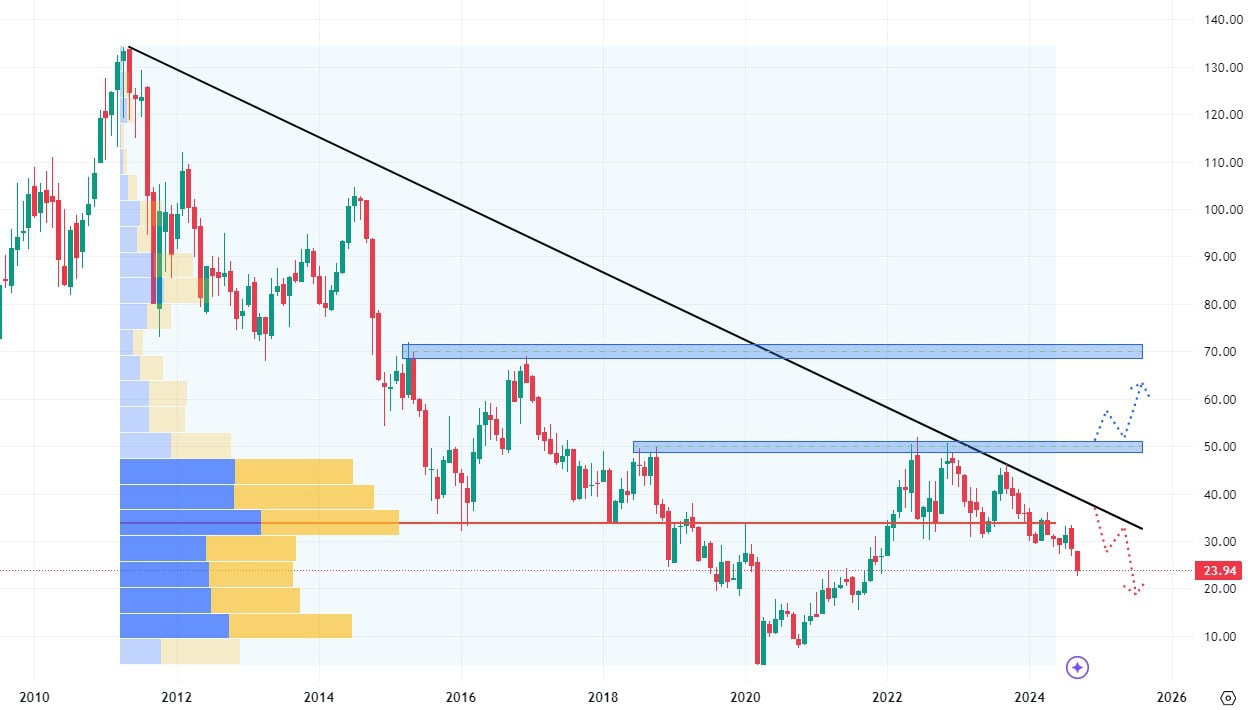 Akcie APA Corporation se obchodují dlouhodobě pod hodnotou klesající trendové čáry a nově i pod hodnotou největšího volume.