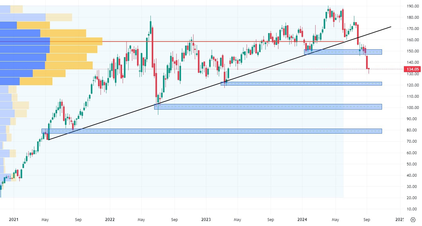 Akcie se také obchodují pod hodnotou klesající trendové čáry a dokud se jim nepodaří tuto dynamickou rezistenci prorazit, budou se nacházet v klesajícím trendu. Nejbližší netestovaný support se nachází na ceně 110 USD za akcii.