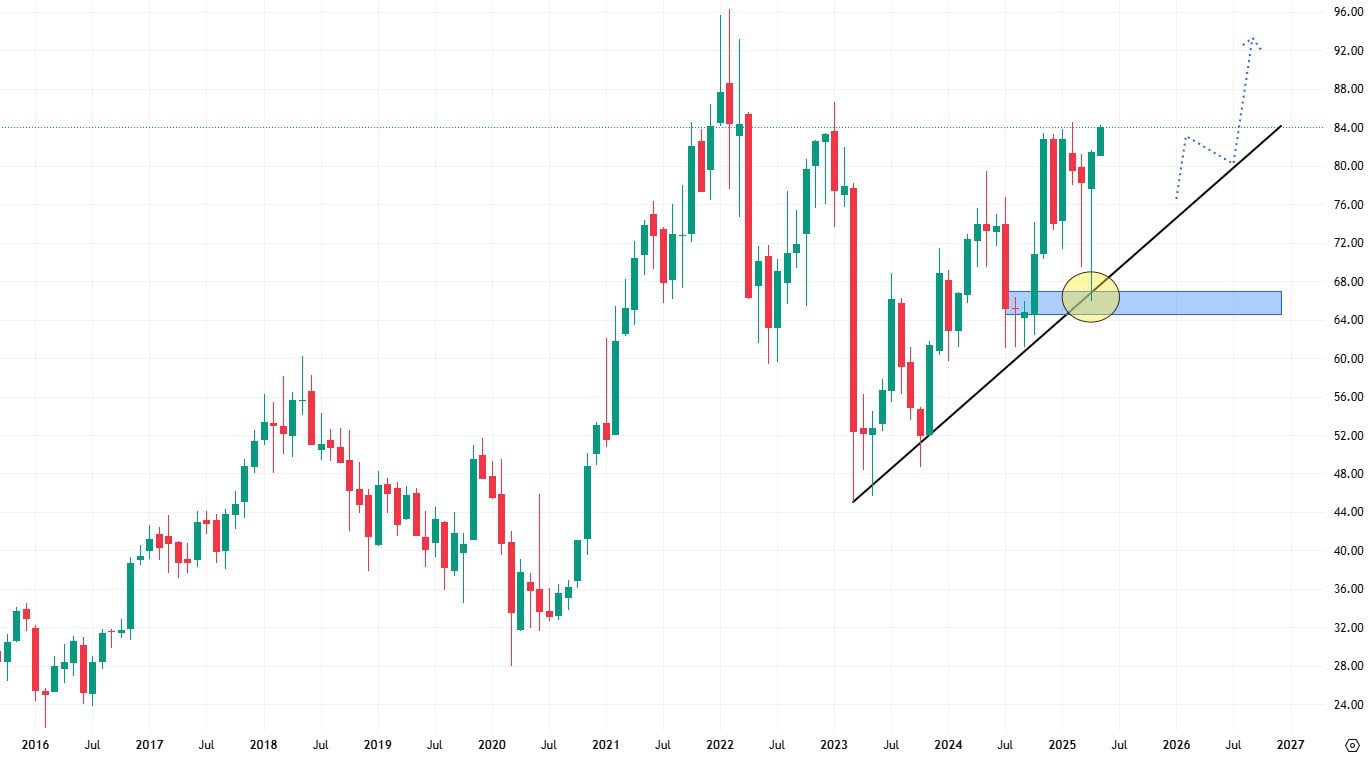 Dokud se budou akcie obchodovat nad hodnotu rostoucí trendové čáry, mohou investoři v klidu spát. Pokud by jejich cena ovšem klesla, na nižších úrovních není moc supportů, což by mohlo způsobit výraznější cenový pokles.