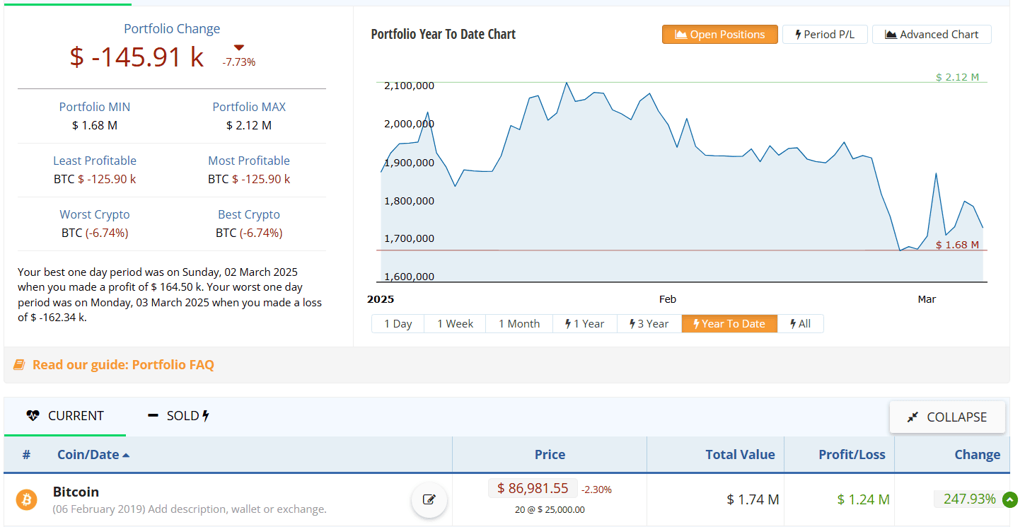 Nástroj je do značné míry personalizovaný, takže můžete mít k dispozici graf vývoje celého portfolia, přehled alokace pomocí koláčového grafu nebo porovnání s vývojem Bitcoinu.