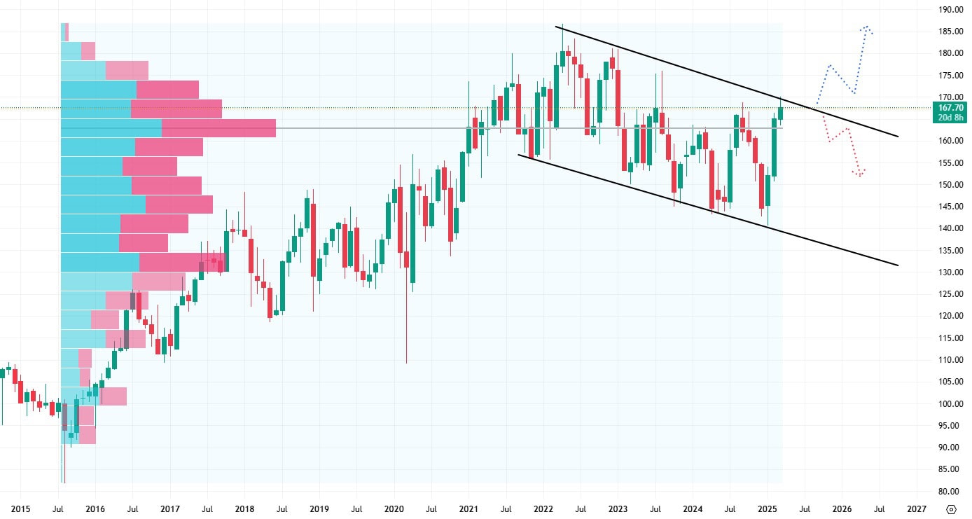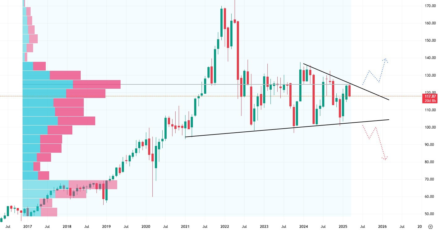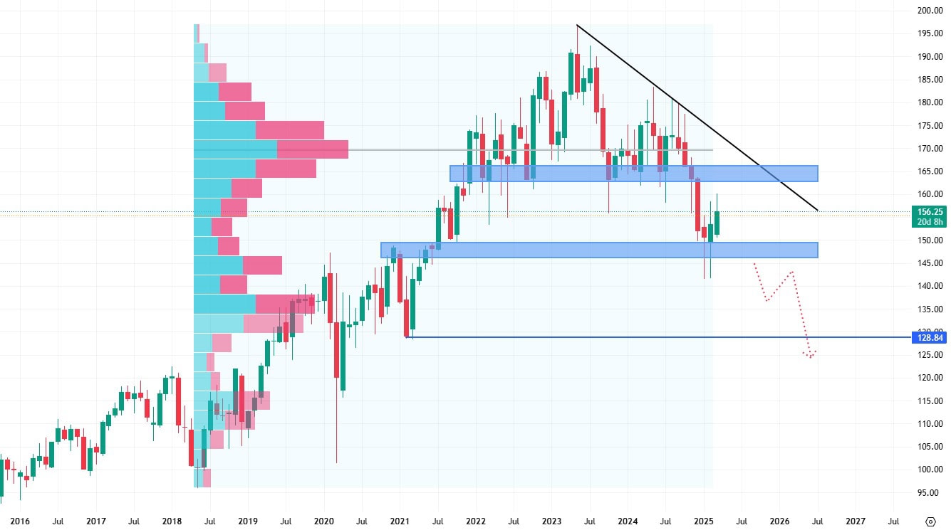 Průraz této rezistence by akciím otevřel cestu na vyšší hodnoty, zatímco pokles ceny akcií pod support na 145 USD by znamenal výraznější cenové oslabení.