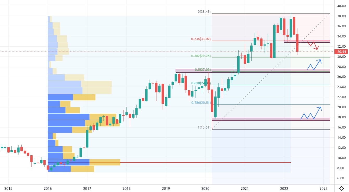 Při pohledu na akciový graf lze konstatovat, že vývoj probíhá cyklicky. Nejbližší supportní i rezistentní zóny odpovídají Fibonacciho úrovním, což zlepšuje predikční možnosti na tomto aktivu. Pokud dojde k poklesu akcií pod cenu 26 USD, je vysoká pravděpodobnost pádu až na cenu 18 USD, kde se nachází nejvýraznější supportní zóna. Společnost CSX vyplácí kvartálně dividendy, přičemž poslední oznámená byla ve výši 0,1 USD za akcii.