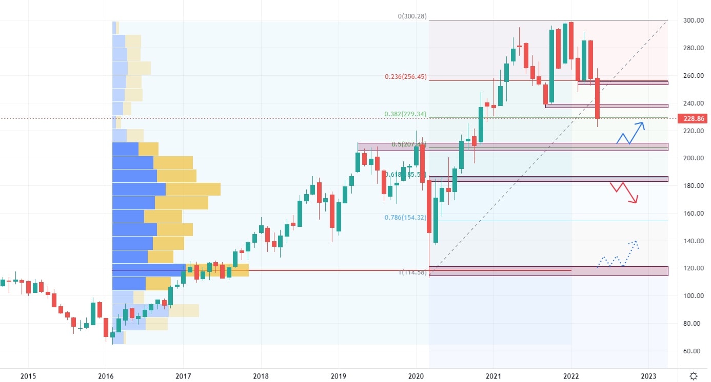 Pro letošní rok a rok následující, je počítáno s růstem tržeb o cca 2-3 miliardy dolarů, čímž by se měly obnovit tržby do předpandemické výše. Akcie Union Pacific se obchodují v úzkém rostoucím kanále, který za sebou zanechal velké množství supportních zón. Tou nejvýraznější je cenová úroveň 175 USD, kde se nachází konfluence s vysokým Volume a 61,8 % Fibonacciho Retracementu. Union Pacific vyplácí dividendy ve výši 1,3 USD za akcii s kvartální frekvencí.