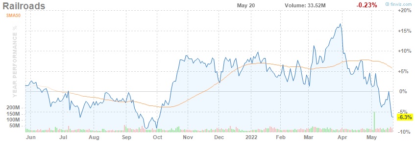 Tato společnost se zaměřuje především na přepravu zemědělských komodit, dobytku, řeziva a dalších materiálů. Stagnace akciového růstu této společnosti probíhala téměř celý rok 2021, což je dobrá zpráva v tom smyslu, že tento titul je odolný proti pandemickým restrikcím, ovšem špatná zpráva je, že i ona vykazuje v současné době pokles hodnoty svých akcií. Norfolk Southern eviduje meziroční nárůst tržeb o 16,5 % a tržby budoucí se odhadují na částku okolo 12,5 miliardy USD pro rok 2022 i rok 2023.