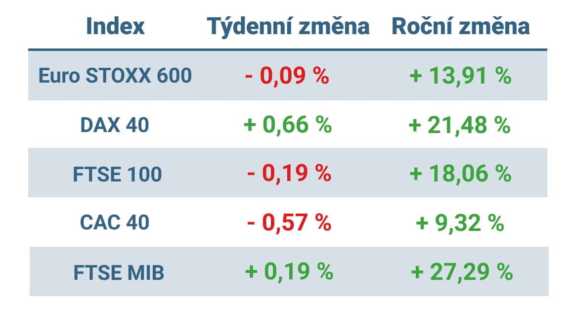 Tabulka ukazuje vývoj nejvýznamnějších evropských indexů v tomto týdnu a v roce 2025