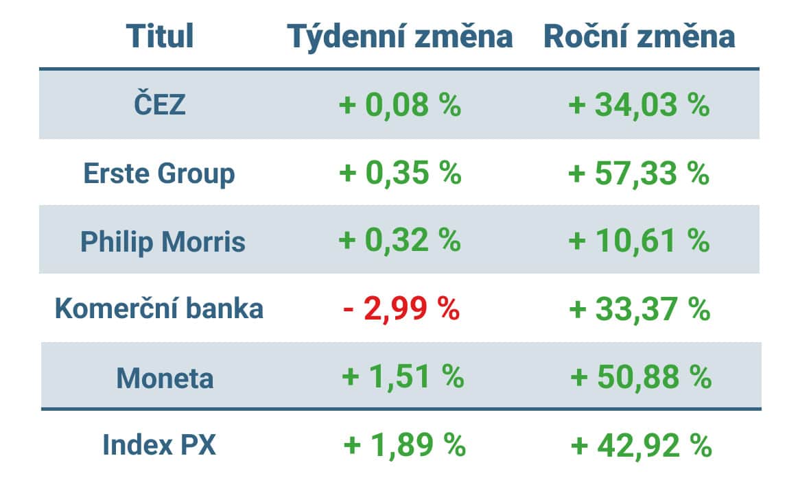 Pražská burza má za sebou další růstový týden – index PX posílil o necelá 2 % a vyšplhal se na další zavírací maximum 2 569 bodů. Z námi sledovaných titulů nejvíce posílila Moneta, která přidala 1,51 %.