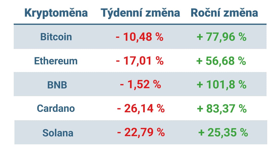 Dokonce přes 20 % hodnoty pak ztratily v týdenním srovnání Cardano a Solana. Relativně stabilní tak zůstal pouze nativní tokenkryptoměnové burzy Binance, tedy BNB, který odepsal pouze 1,5 % hodnoty.