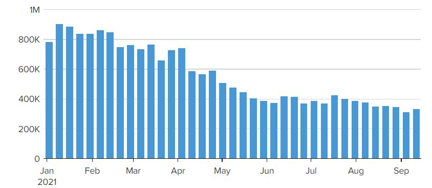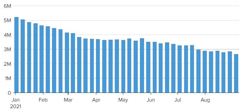 Celkový počet lidí, kteří pobírají státní podporu se v týdnu končícím 4. září snížil o 187 000 na 2,665 milionu, což je nejnižší úroveň od poloviny března 2020.
