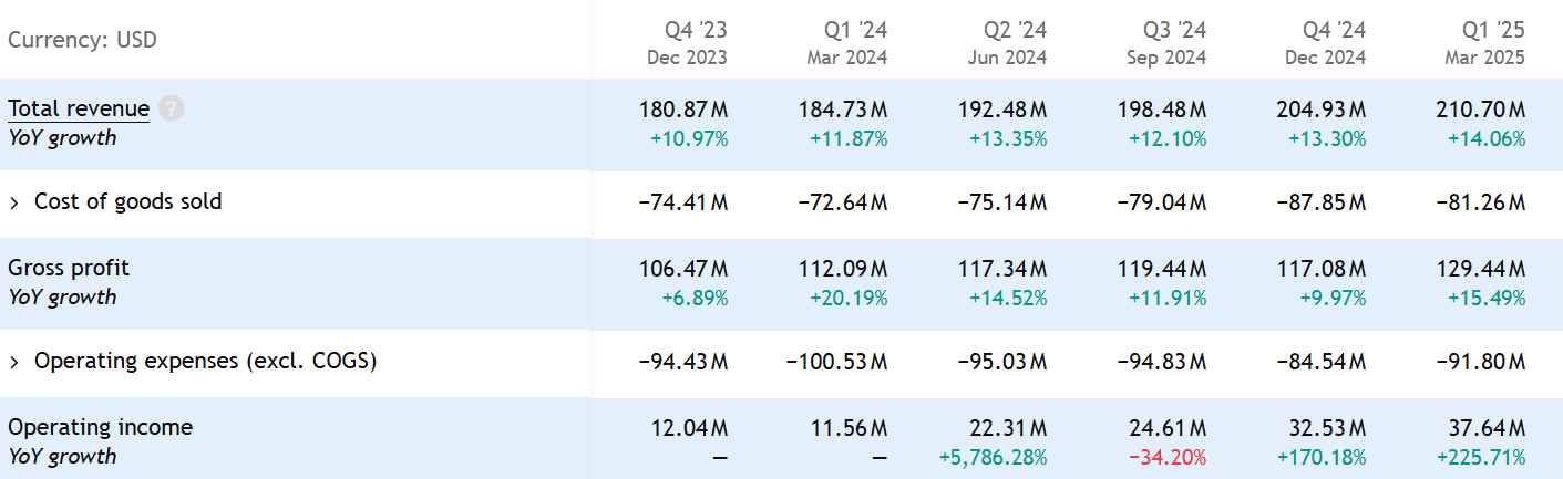 DigitalOcean vykazuje solidní finanční výsledky. Tržby v prvním čtvrtletí 2025 meziročně vzrostly o 14 % na 210,7 milionu USD.