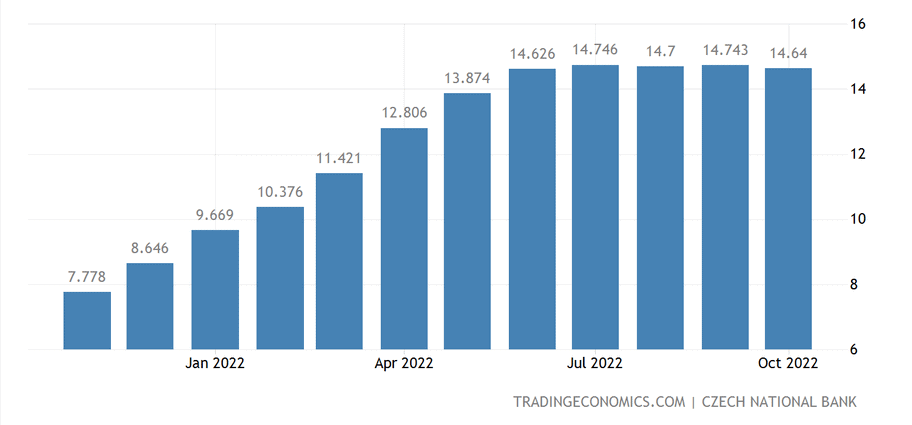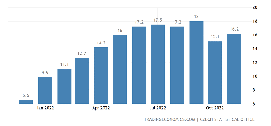 Tuzemská inflace za listopad dosáhla 16,2 %, což je oproti předešlému měsíci nemalé zhoršení situace. Bohužel vidíme, že dosavadní měnová politika České národní banky zcela selhává v boji s tímto fenoménem, který se dá řešit prakticky pouze růstem základní úrokové sazby. Ale jak všichni víme, tuzemská centrální banka s restrikcemi přestala, jakmile došlo k obměně v bankovní radě. Bují nám tu proto velký problém, který se bude muset časem řešit.