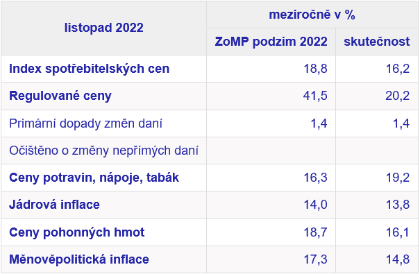 Podle dnes zveřejněných údajů ČSÚ vzrostla v listopadu 2022 cenová hladina meziročně o 16,2 %. Inflace tak ve srovnání s říjnem stoupla a nacházela se nadále vysoko nad horní hranicí tolerančního pásma cíle ČNB (2 %). Inflace za listopad činila 16,2 %, takže je o více jak celý procentní bod vyšší oproti říjnu. Naměřená inflace je stále výrazně pod původními odhady ČNB, které byly zhruba o 2 procentní body výše. Vtip je ale v tom, že ty nejdůležitější složky celkové inflace příliš neustupují.