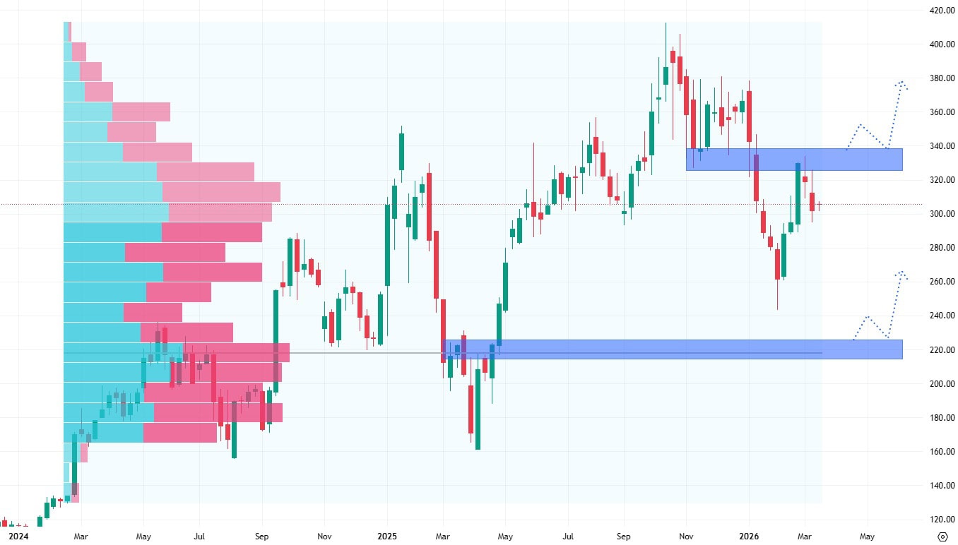 Nejbližší support se přitom nachází až na 230 dolarech. V této oblasti najdeme jak cenový výběžek, tak i největší objem obchodů (volume) od roku 2024.