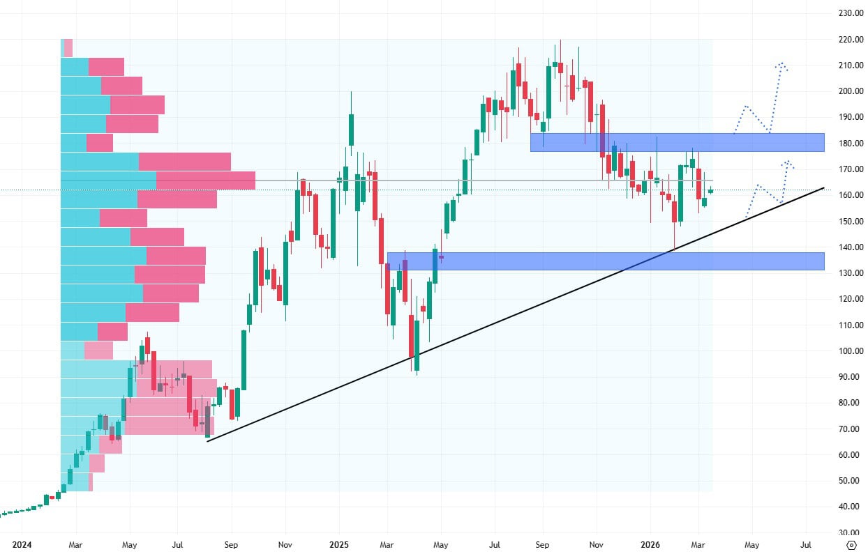 Pokud by se jim nakonec podařilo rezistenci na úrovni 180 dolarů prorazit, otevřela by se jim cesta k dalšímu zhodnocení.