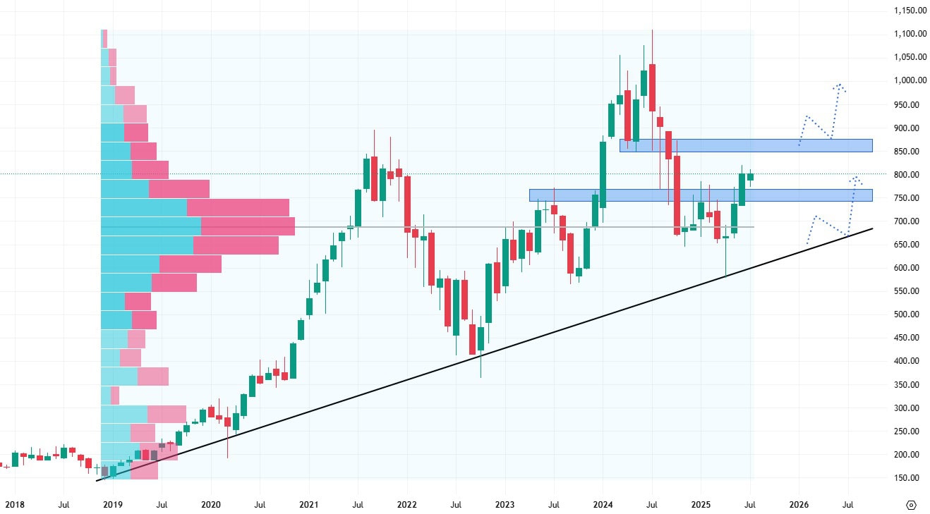 Akcie pomalu míří k hodnotě rezistence na 900 USD, kde se nachází proražené low menší prodejní korekce.