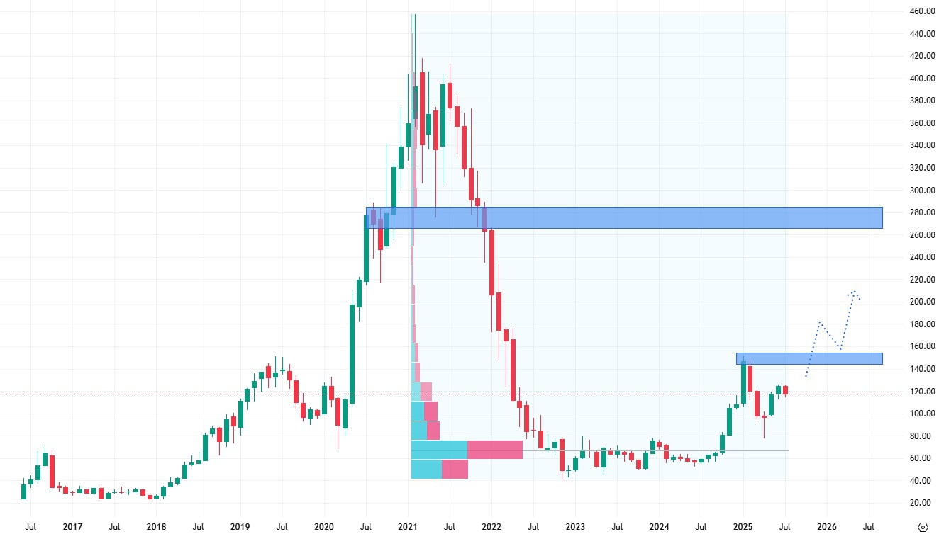Akcie Twilio se vzpamatovávají z výrazného cenového poklesu. V současné době se akcie obchodují v růstovém trendu a nad hodnotou největšího volume. Pokud by prorazily i své swingové maximum, otevře se jim cesta k návratu na vyšší hodnoty.