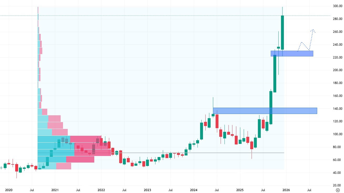 Právě tento support by akcie měly podle negativní cenové predikce v roce 2026 otestovat. Pozitivní cenová predikce ovšem očekává jejich výrazný cenový růst a tvorbu nových maxim.