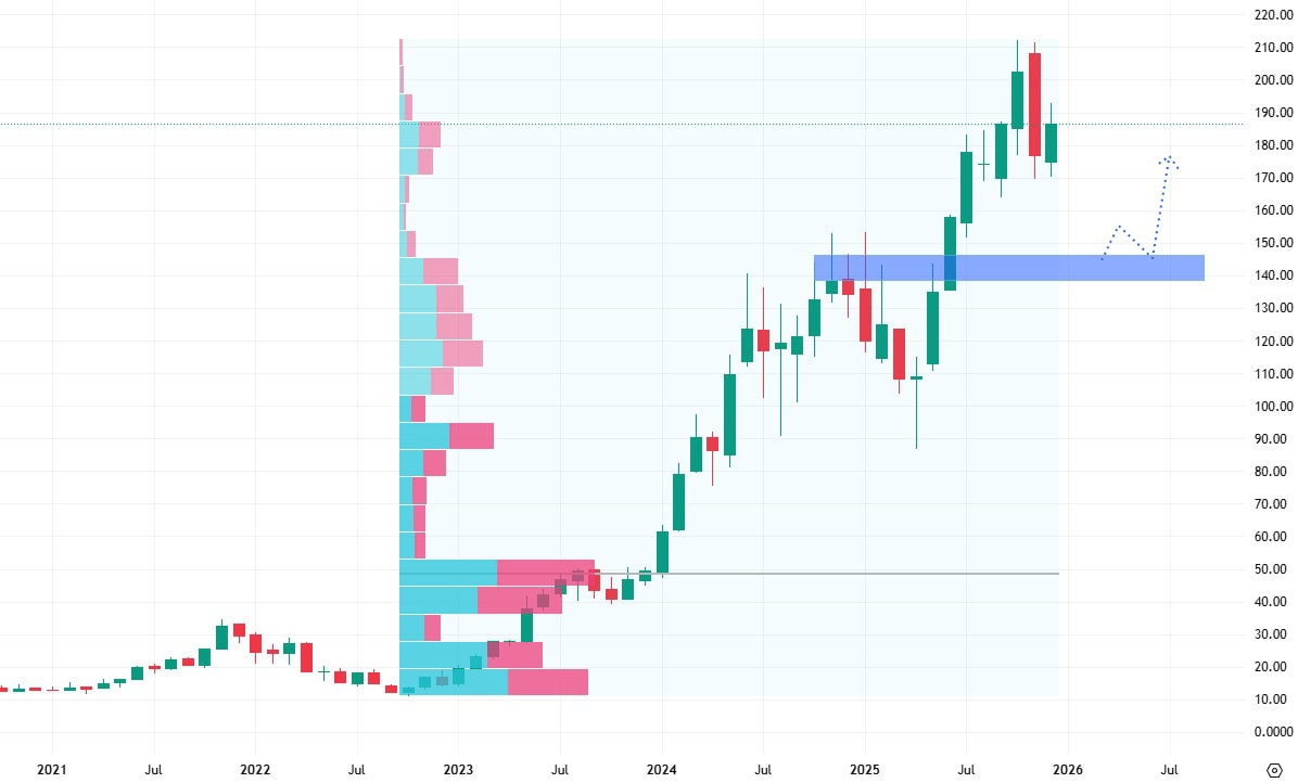 Tato technologická ikona vygenerovala meziroční růst svých tržeb o 65,22 % a s růstem se počítá i v roce 2026, kdy by měly atakovat hodnotu 213,29 miliardy USD a také v roce 2027, kdy by se jejich hodnota měla vyšplhat na 319,85 miliardy USD.