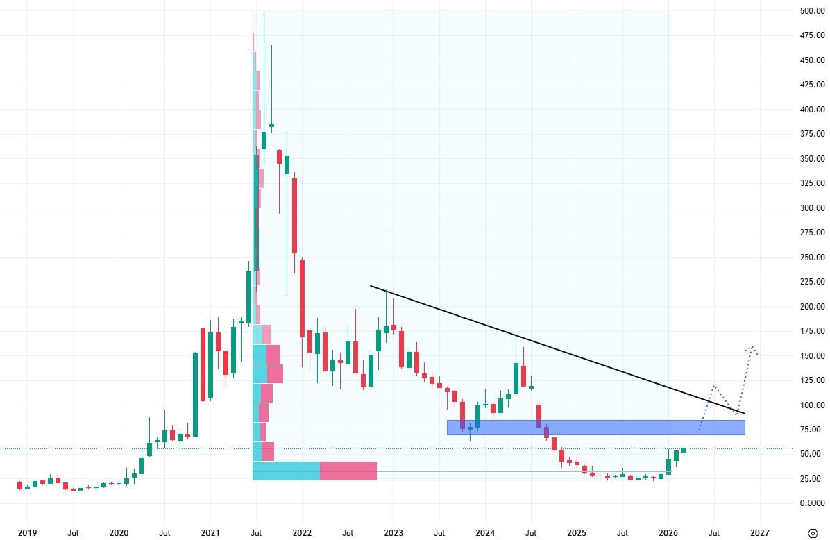 Pokud by se ale akciím podařilo prorazit rezistenci okolo 75 dolarů, kde figuruje i klesající trendová čára, mohlo by se jednat o velmi důležitou událost pro obrat trendu.