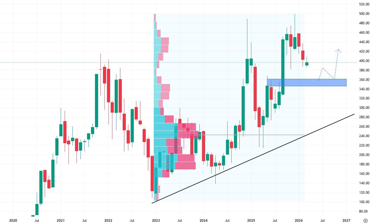 Pozitivní cenová predikce očekává tvorbu nových historických maxim, ovšem negativní cenová predikce počítá s poklesem akcií i pod hodnotu supportu a s otestováním hodnoty rostoucí trendové čáry.