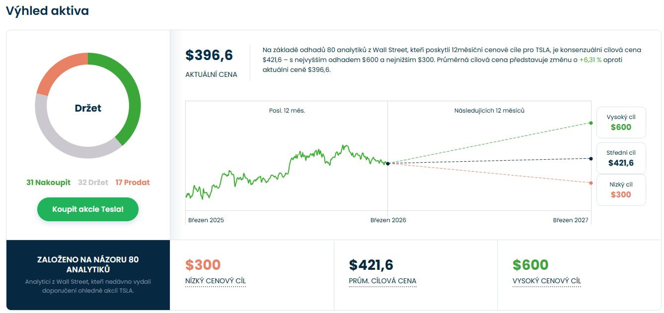 Cenové predikce pro tyto akcie se zúčastnilo celkem 80 analytiků z Wall Street a 31 z nich doporučuje akcie nyní nakoupit, ale 32 analytiků by s jejich nákupem či prodejem zatím počkalo. Dokonce 17 analytiků by akcie Tesly prodalo ihned.