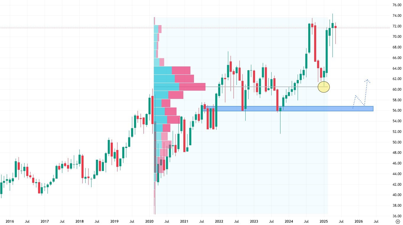 Akcie Coca-Cola se obchodují v dlouhodobém rostoucím trendu a v současné době i těsně pod svými cenovými maximy. Cenové svíčky vytvářejí dlouhé knoty, což může značit nákupní momentum a pokračování růstového trendu.