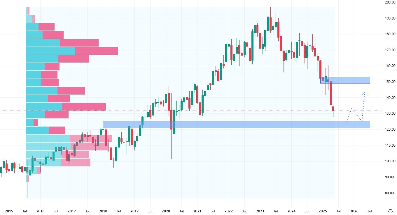 Akcie PepsiCo se obchodují v prodejní korekci, přičemž se blíží k hodnotě supportu. Ten je tvořen jednak proraženými cenovými maximy z roku 2017, ale také hranou volume profilu. Nejbližší rezistence se nachází na ceně 150 USD.