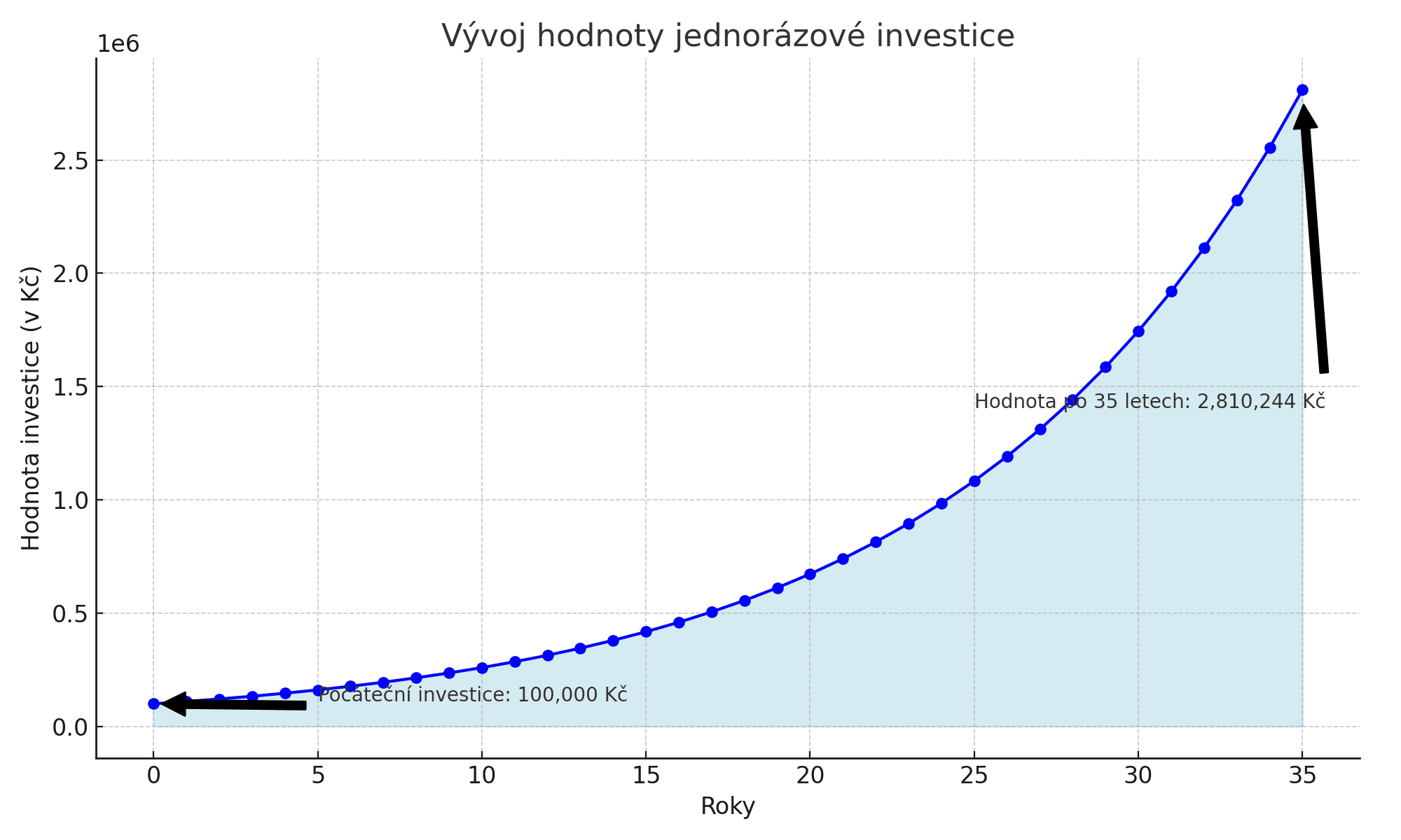 Graf vývoje hodnoty jednorázové investice ve výši 100 000 Kč s průměrným zhodnocením 10 % ročně po dobu 35 let
