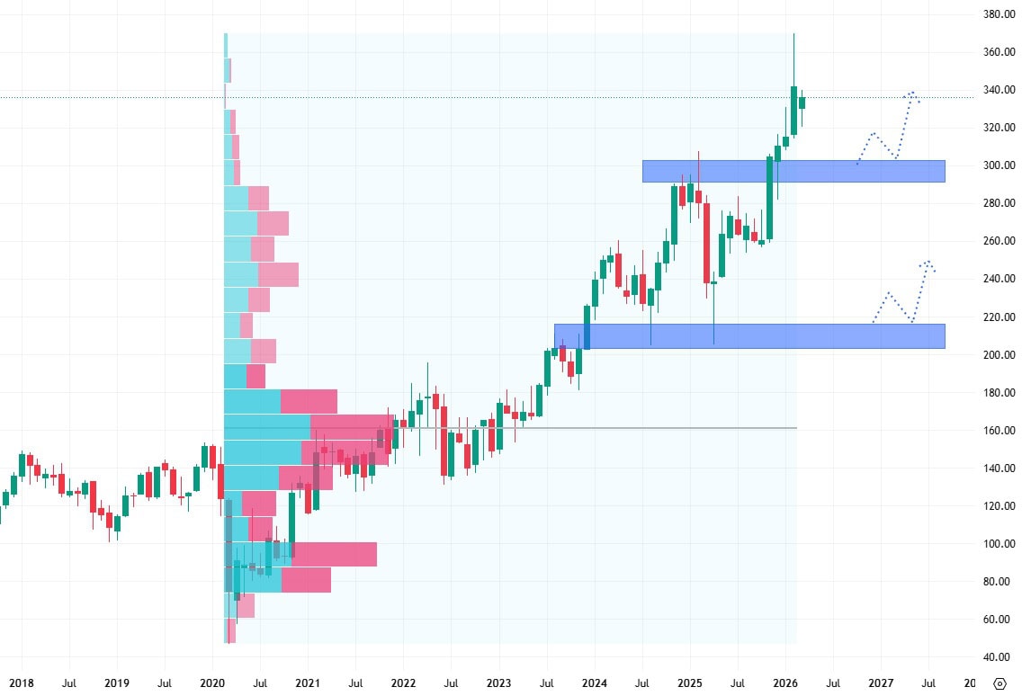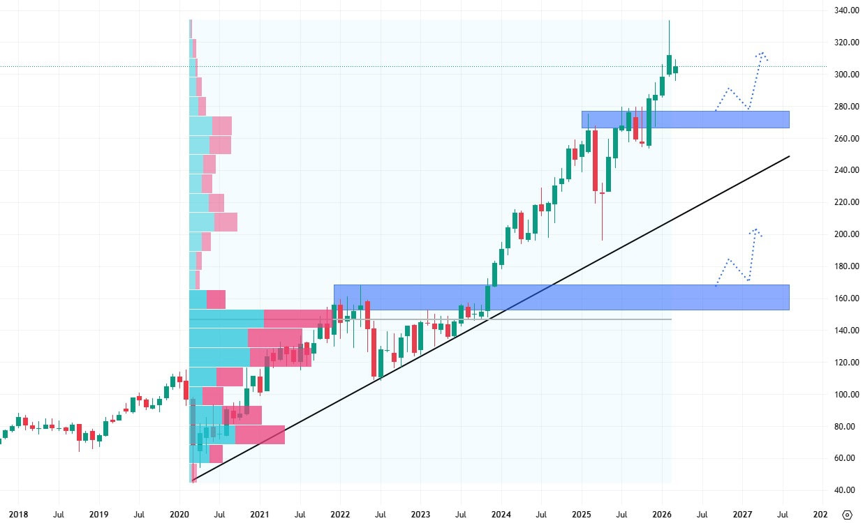 Nejbližší support se nachází na úrovni starších proražených cenových maxim, tedy okolo 300 dolarů. Tato technická úroveň tak přímo vybízí akcie k pullbacku a k následnému pokračování v rostoucím trendu.