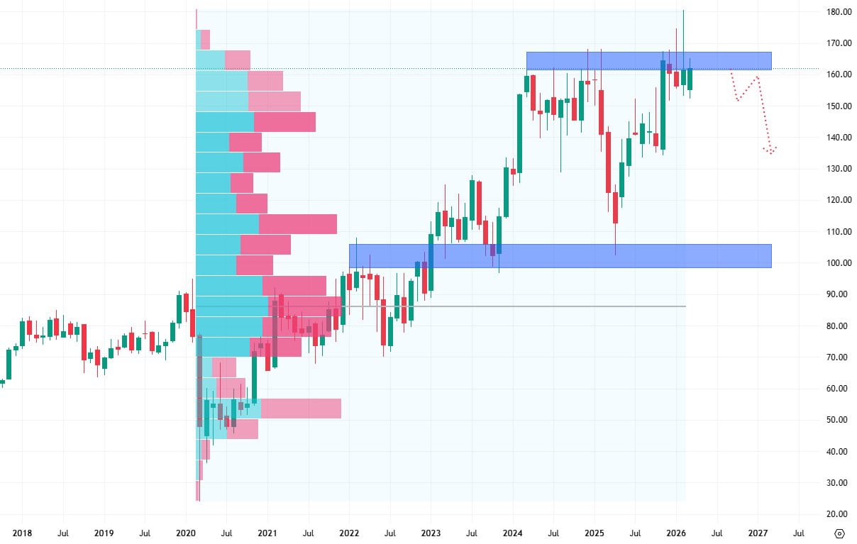 Nevýhodou těchto akcií je, že v případě širší prodejní korekce se nejbližší support nachází až na ceně 100 dolarů, což by při současné valuaci mohlo znamenat poměrně výrazný cenový propad.