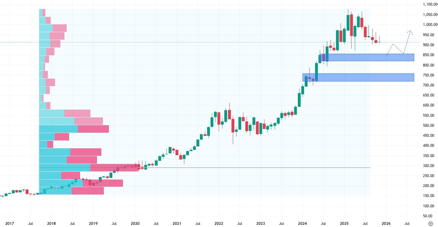 V případě cenového průrazu nejbližšího supportu by se další nacházel až na ceně 750 USD za akcii a prozatím nebyl otestovaný, což zvyšuje jeho důležitost.