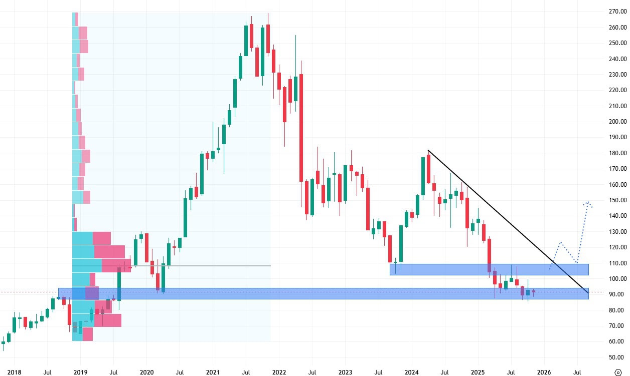 Akcie Target se obchodují v dlouhodobém down trendu, ovšem jejich pokles se zastavil na jednom z posledních supportů na ceně 90 USD.