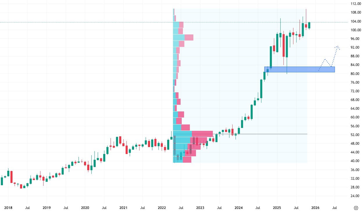 Nejbližší rezistence se nachází velmi blízko a to na ceně 110 USD a trh jí zatím jen otestoval. Pokud by došlo k proražení, nachází se v blízkosti ještě klesající trendová čára, která rovněž plní roli dynamické rezistence.