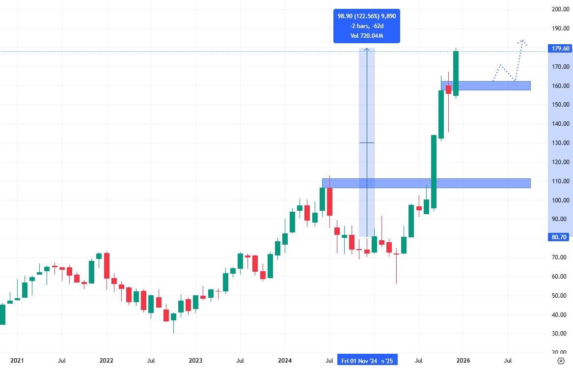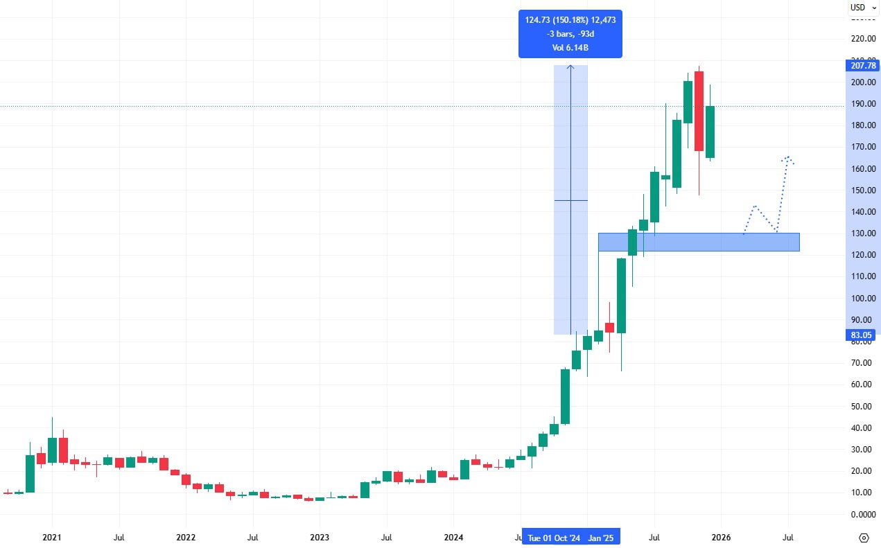 Akcie Lam Research si v roce 2025 připsaly růst téměř 173 % a v závěru roku se obchodují poblíž svých cenových maxim. Trh díky prodejní korekci vytvořil blízký support, který může být brzy využitý jako úroveň pro pullback před dalším růstem.