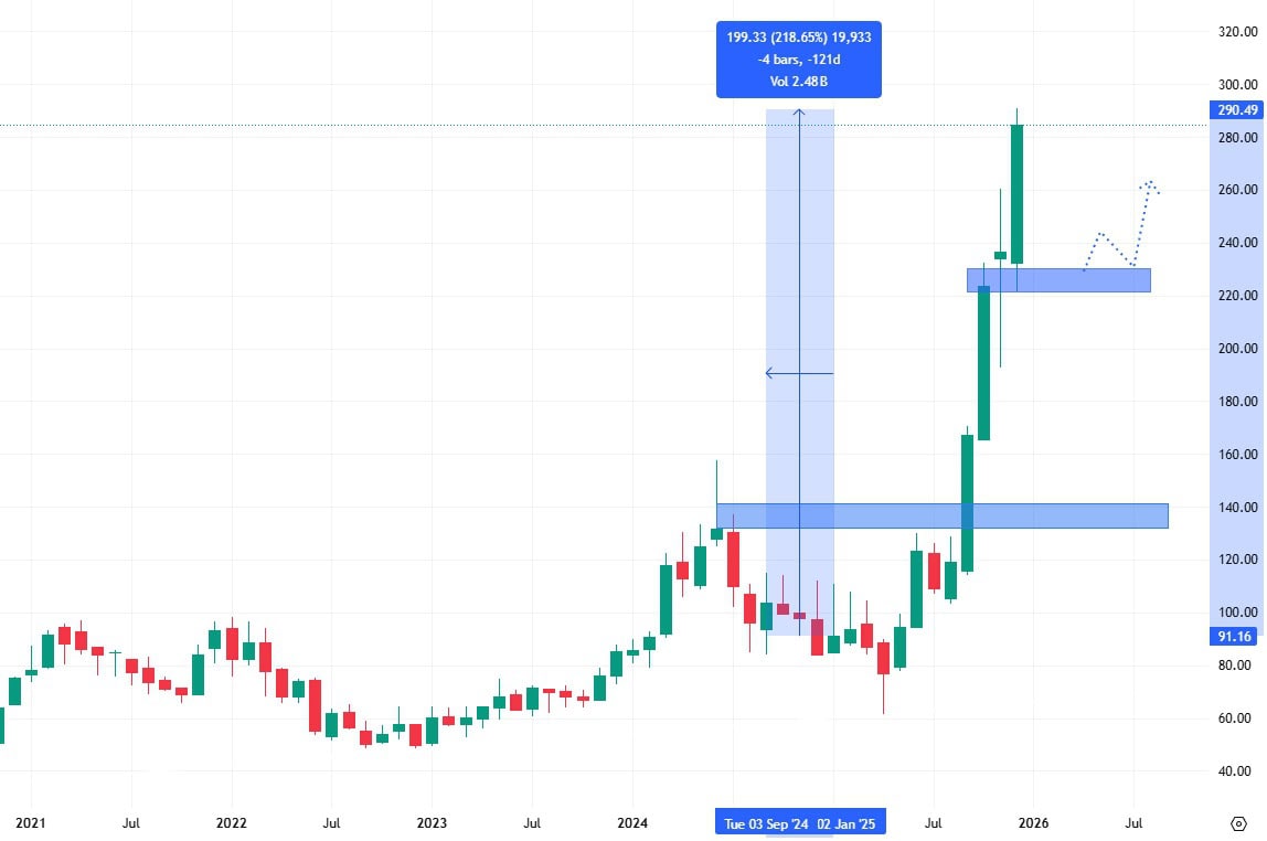 Akcie Micron se obchodují ve velmi agresivním rostoucím trendu s nejbližší supportem na ceně 230 USD. V roce 2025 dokázaly vygenerovat úctyhodný růst o téměř 219 %.