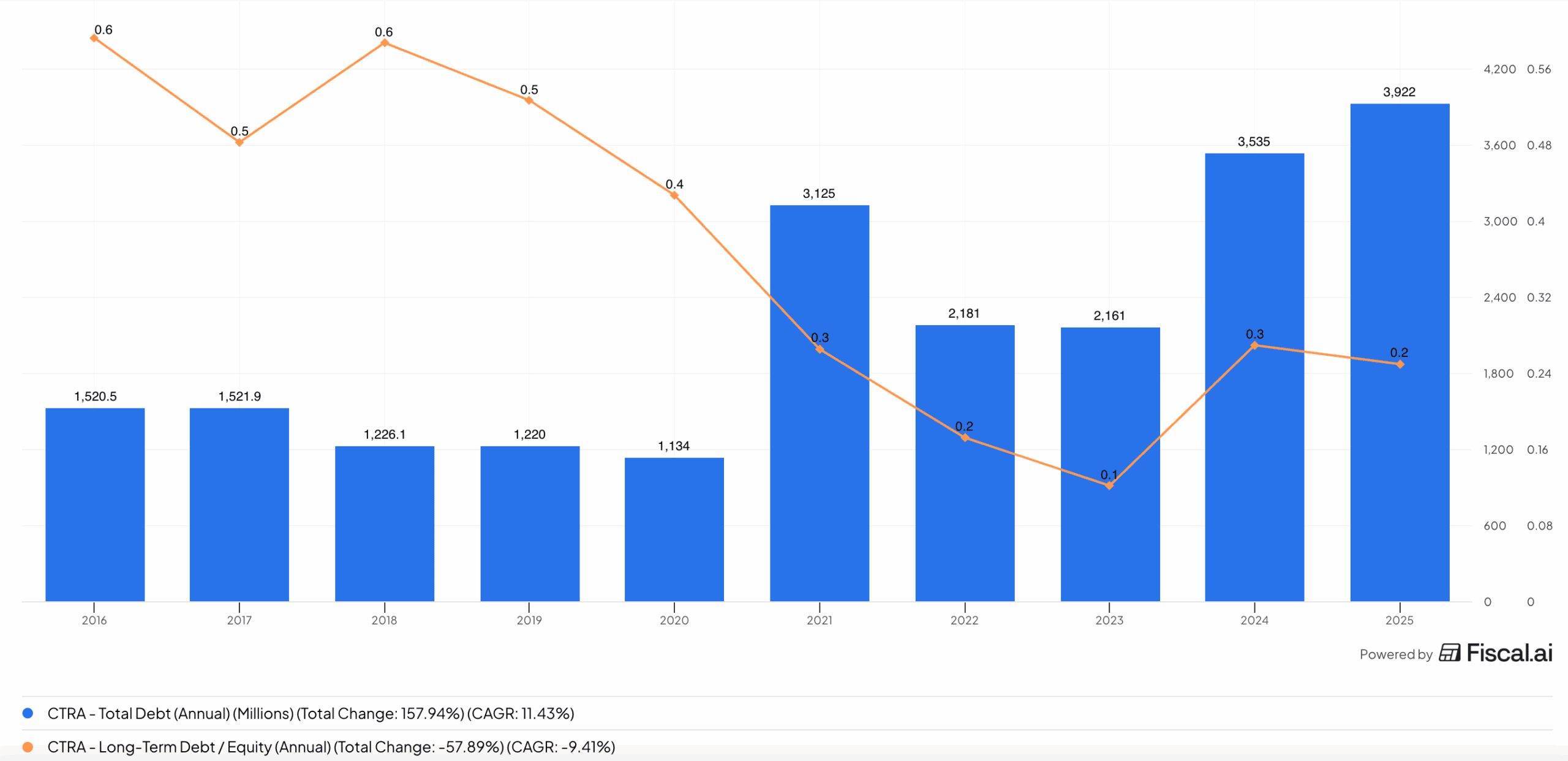 Celkové zadlužení Coterra Energy roste ovšem D/E poměr má spíše klesající tendenci
