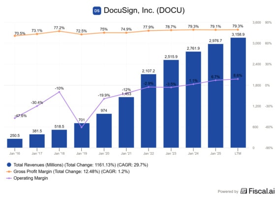 DocuSign je lídrem v oblasti elektronických podpisů a správy digitálních smluv. Během pandemie zažil prudký růst, který se však po návratu do normálu výrazně zpomalil.