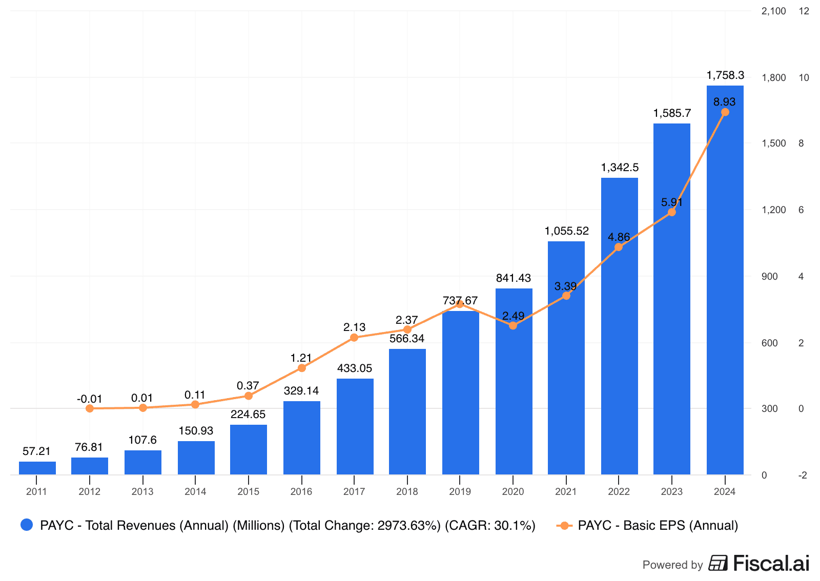 Dlouhodobý vývoj tržeb a EPS společnosti Paycom