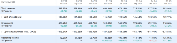 Společnost v posledních třech letech rostla průměrným tempem 23 % ročně, přičemž za rok 2024 tržby vzrostly o 28,8 %. Provozní zisk dosáhl 310 milionů USD. Hrubá marže je úctyhodných 80 %.