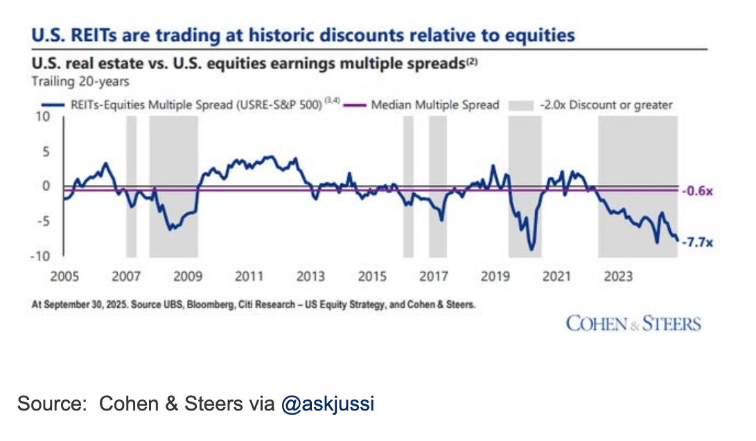 Podle analýz Cohen & Steers se americké REITy obchodují vůči běžným akciím na jedné z největších slev za posledních dvacet let – cash-flow násobky jsou hluboko pod dlouhodobým průměrem a aktuální spread se pohybuje kolem –7,7násobku oproti historické hodnotě kolem –0,6násobku.