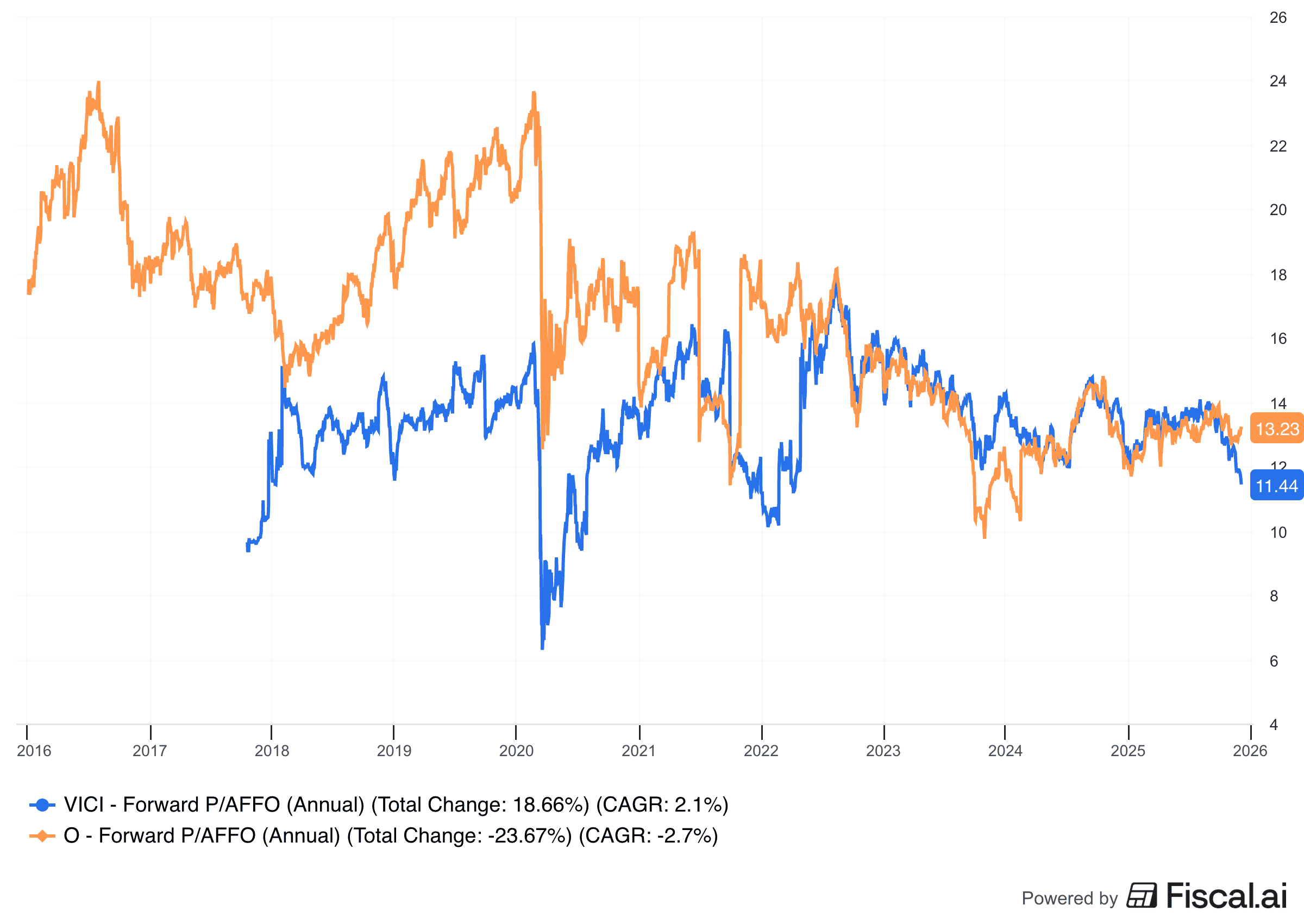 Na grafu níže je proto vidět, že se akcie Vici Properties i Realty Income obchodují za relativně nízké forward P/AFFO (AFFO – upravené prostředky z provozní činnosti, které se u REITů používají jako ekvivalent čistého zisku)okolo 11–13, tedy levněji než mnoho “módních” titulů.