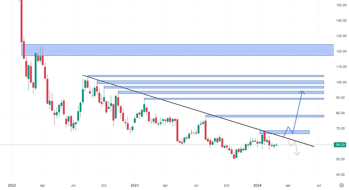 Akcie PayPal se obchodují pod hodnotou klesající trendové čáry poté, co si trh prošel velmi výrazným cenovým propadem. Pro tuto růstovou akcii bude stěžejní moment, při kterém dojde k průrazu trendové čáry, čímž se změní tržní sentiment z negativního na pozitivní.
