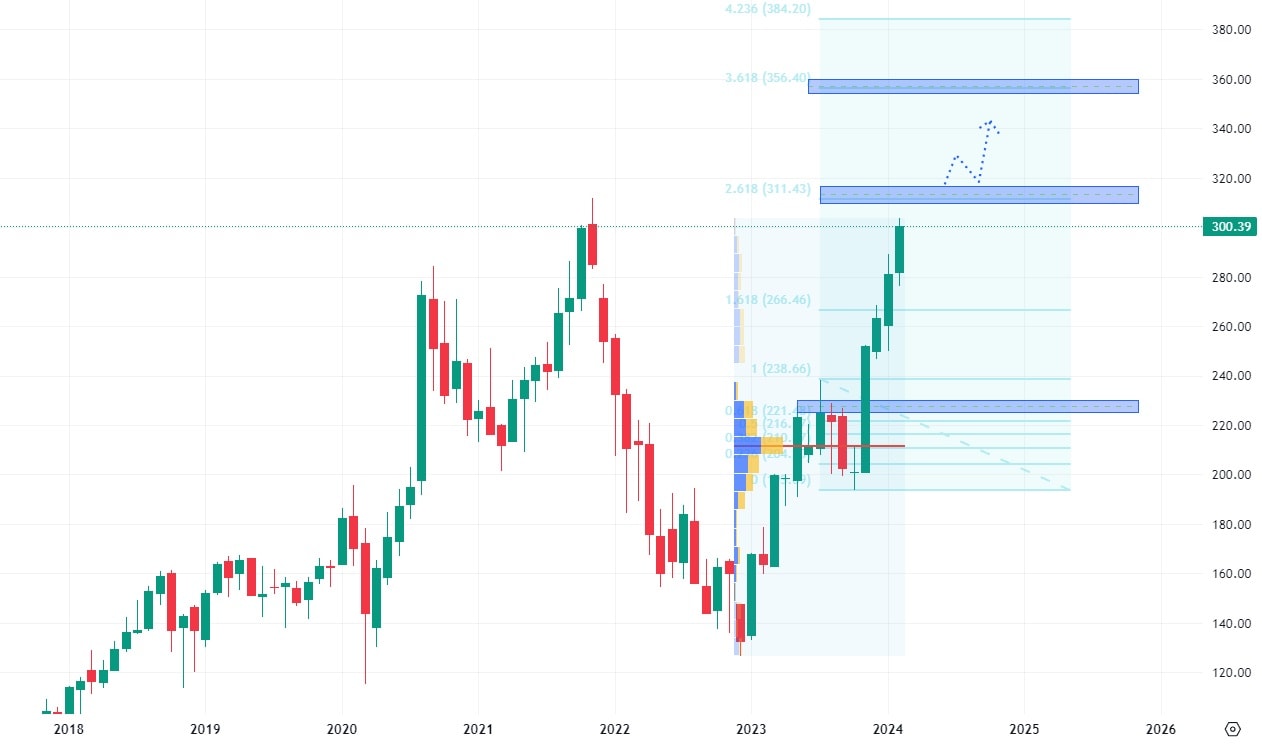 Pokud akcie prorazí své ATH a zároveň tuto rezistenci, získají výrazný support a možnost růstu až na hodnotu 360 USD. Tam se totiž nachází další projekční rezistence na základě Fibonacciho úrovní.