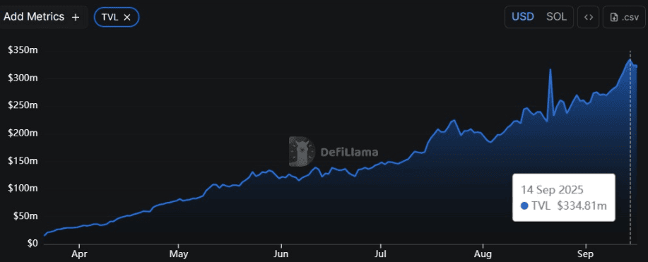 Podle dat serveru DefiLlama dosáhlo TVL Pump.fun v neděli 334 milionů dolarů. Tato platforma dokonce překonala z hlediska tržeb burzu Hyperliquid, která se zaměřuje na perpetual aktiva.