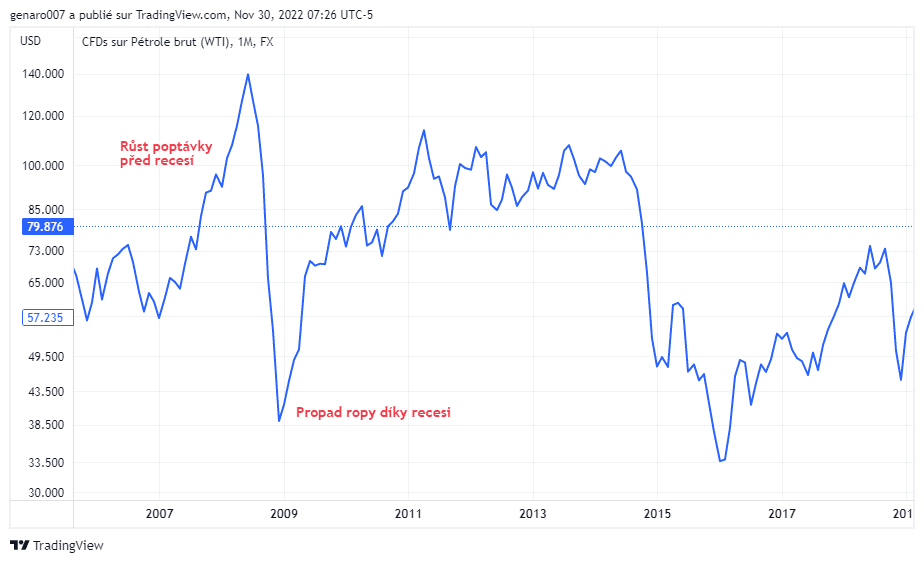 Pokles trhu se projeví i na cenách komodit, kdy těžaři a producenti kovů také využívají short pozice na komoditách, aby se ochránili před poklesem poptávky. Právě obchodníci na komoditách se musí nejvíc snažit a zbavit se komodit dřív, než přijde pokles cen způsobený recesí. Vývoj na cenách komodit je totiž v případě recesí brutální a následně se pak cena pohybuje nízko dlouhodobě. Abychom lépe pochopili, jak funguje recese a pokles cen komodit, podívejme se na učebnicový případ poklesu cen ropy během krize 2008.