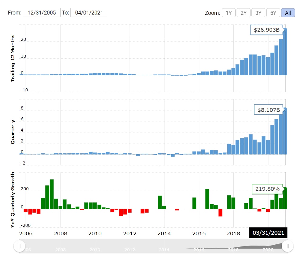 Tržby Amazonu v prvním čtvrtletí meziročně vzrostly o 44 % na 108,5 miliardy dolarů. Čistý zisk společnosti za první čtvrtletí činil 8,1 miliardy dolarů, což představuje výrazný nárůst z 2,5 miliardy dolarů v prvním čtvrtletí před rokem. Silné čtvrtletí tak pomohlo k nárůstu vygenerovaného zisku za posledních 12 měsíců na 26,9 miliardy dolarů.