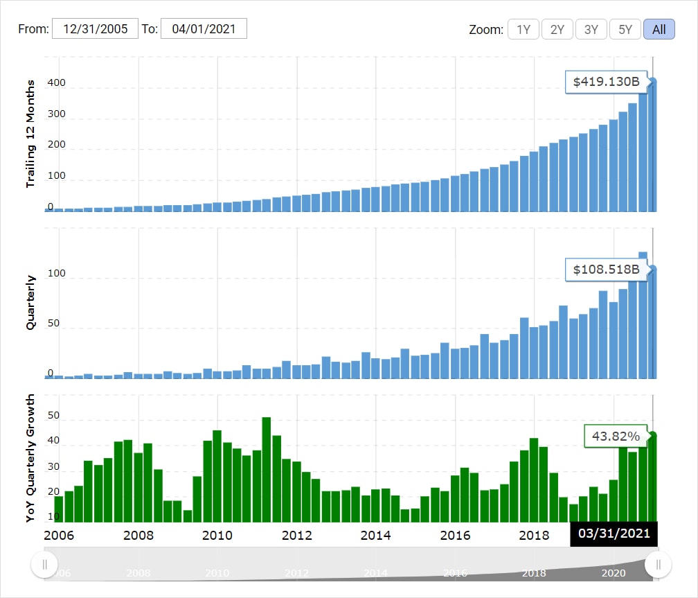Dlouhodobý vývoj tržeb společnosti Amazon v miliardách dolarů. Zdroj: macrotrends.net