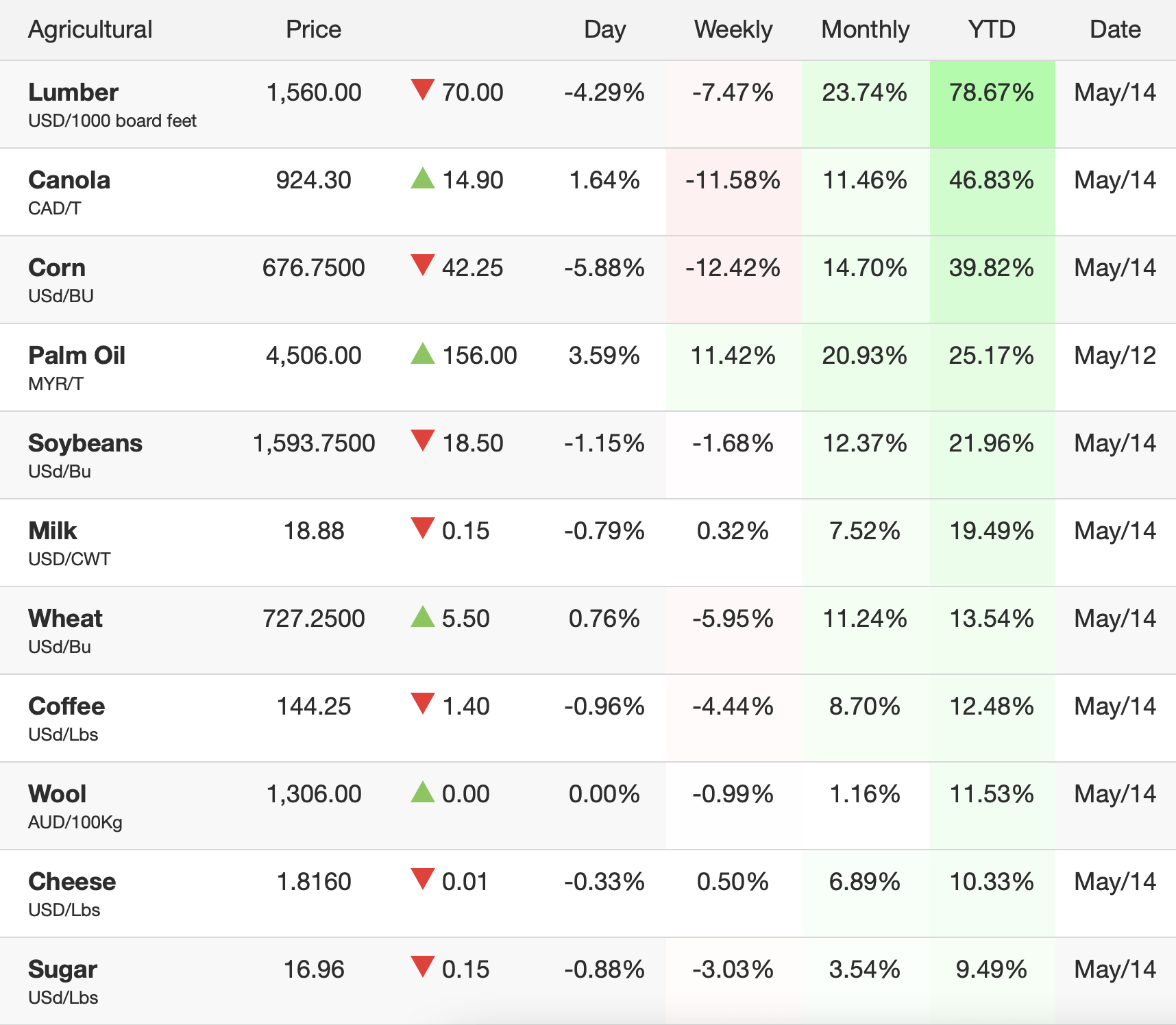 Jako první s masivním nárůstem ceny o 78 % YTD a 23 % za poslední měsíc je dřevo (lumber). Dřevo se používá především ve stavebnictví. Kvůli tomu budou nemovitosti možná ještě dražší. Na druhém místě je Řepka (Canola).