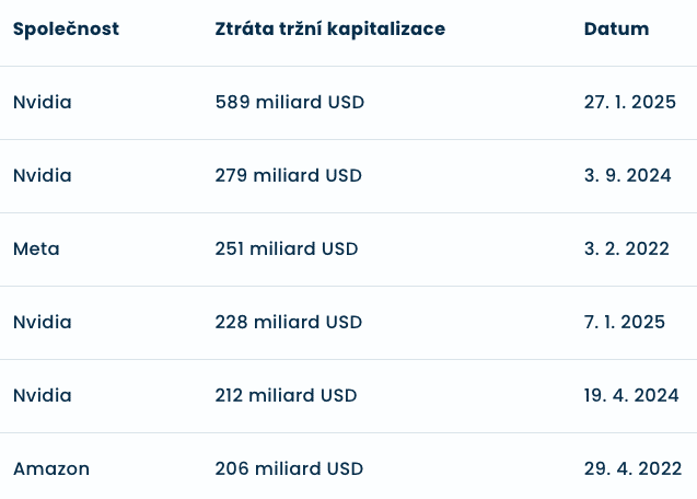 Ačkoli je propad 589 miliard dolarů společnosti Nvidia největší jednodenní ztrátou v historii, není to poprvé, co zažila brutální výprodeje. Zde je srovnání s největšími jednodenními ztrátami tržní kapitalizace v historii: